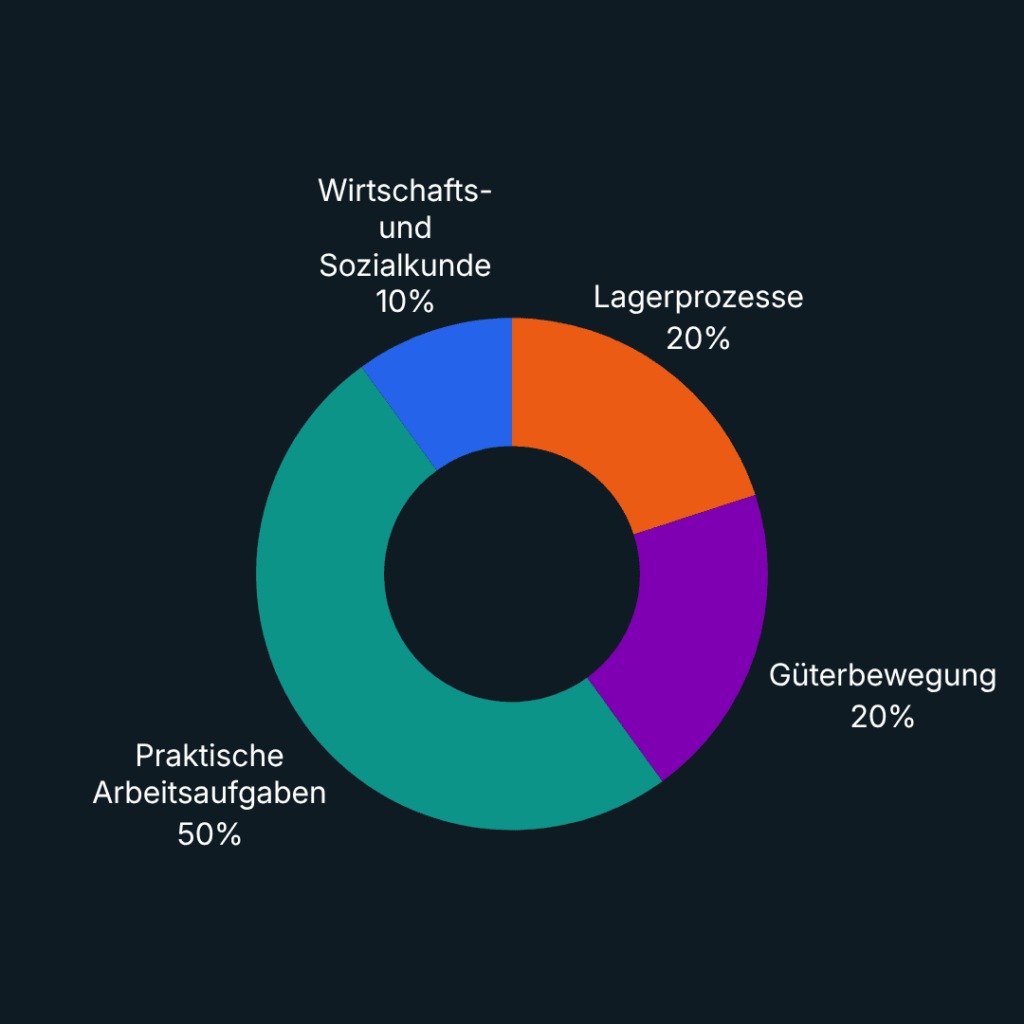 Die Abschlussnote setzt sich aus mehreren Prüfungsbereichen zusammen. Dazu gehören Lagerprozesse (20 %), Güterbewegung (20 %), Wirtschafts- und Sozialkunde (10 %) sowie die praktischen Arbeitsaufgaben (50 %).