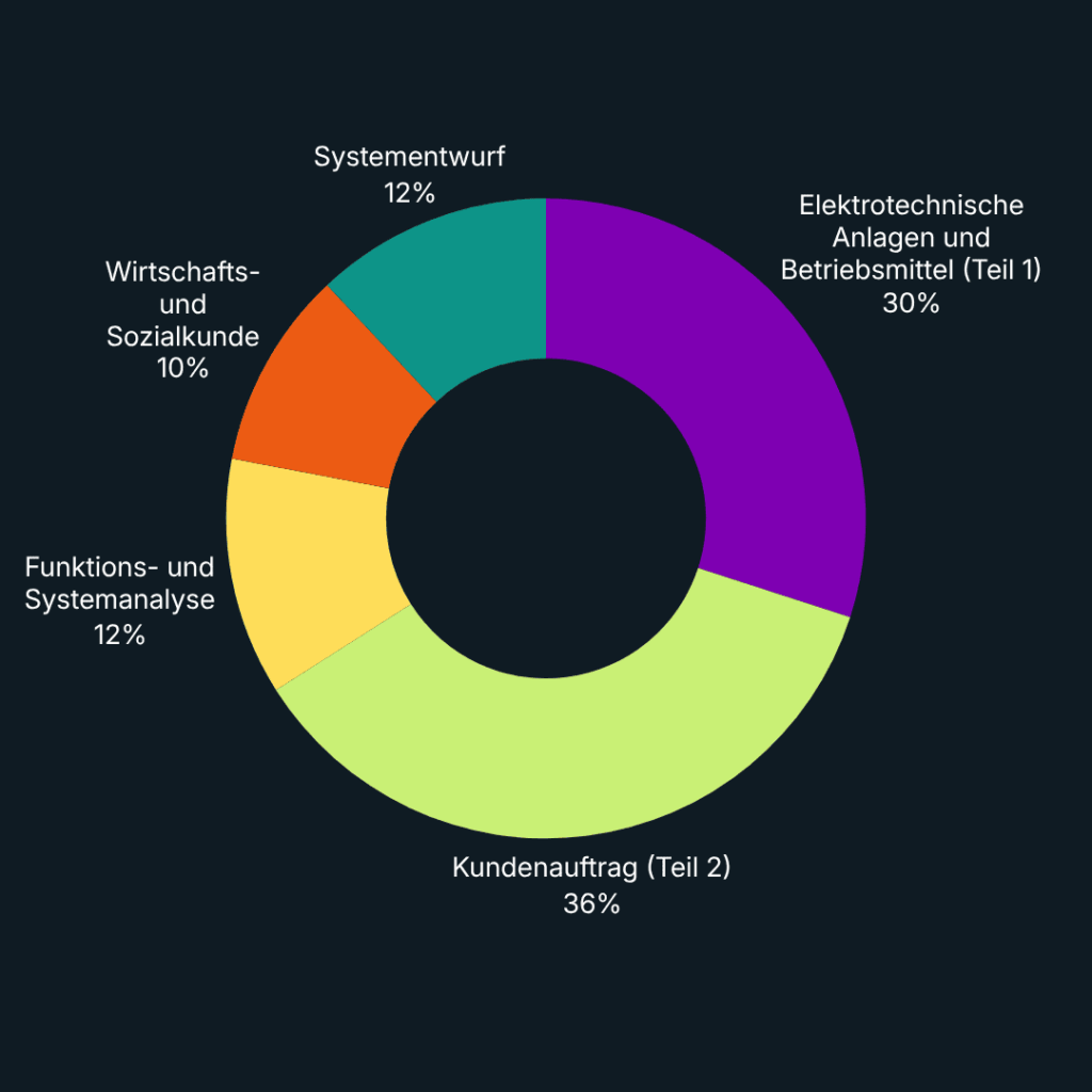 • Elektrotechnische Anlagen und Betriebsmittel, Teil 1 (praktisch): 30 %