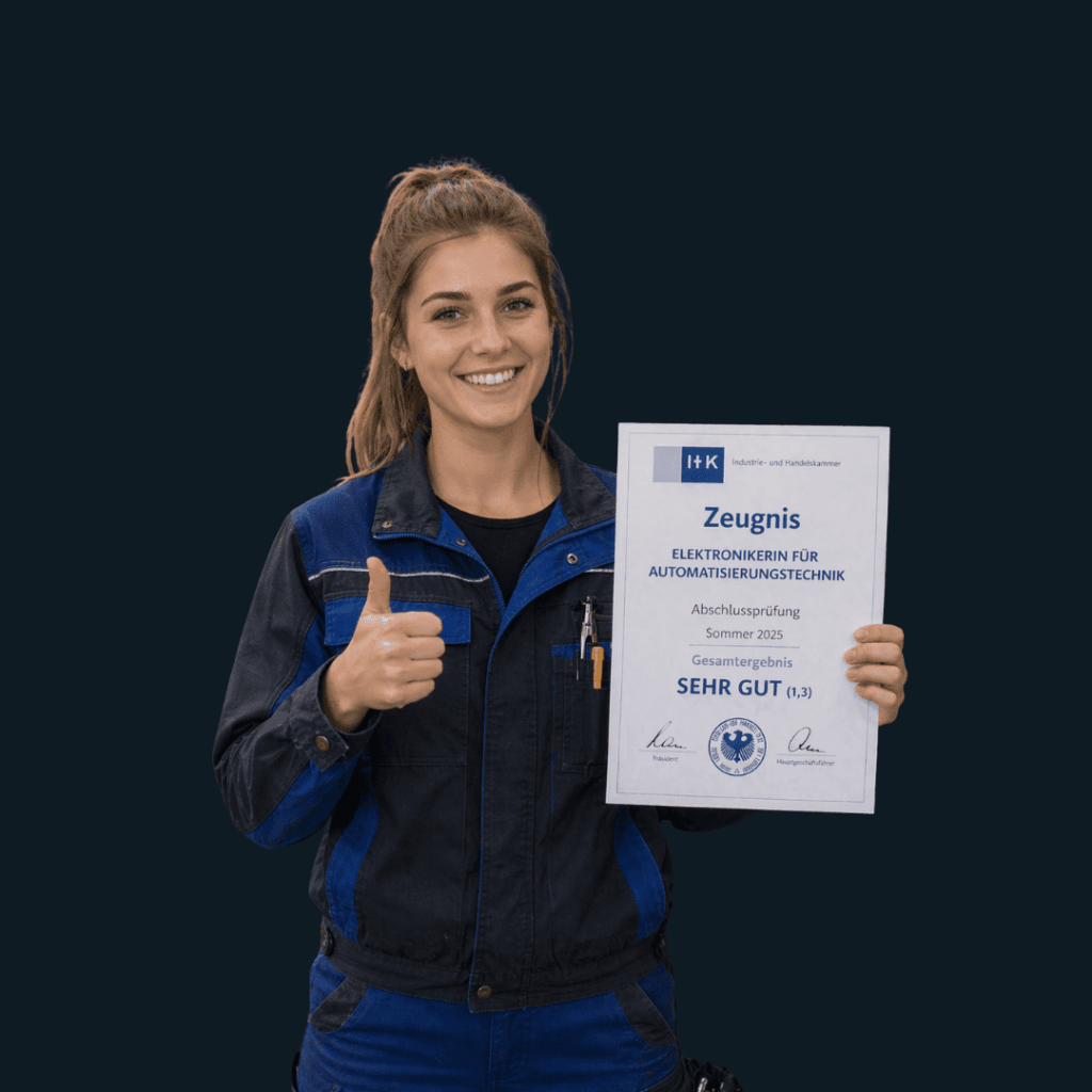 In der Abschlussprüfung Teil 1 zeigst du, dass du mechatronische Teilsysteme selbstständig planen, aufbauen und in Betrieb nehmen kannst. Du führst einen vollständigen praktischen Arbeitsauftrag durch und dokumentierst deine Vorgehensweise. Bewertet werden Planung, Ausführung, Funktionsprüfung und Arbeitssicherheit.