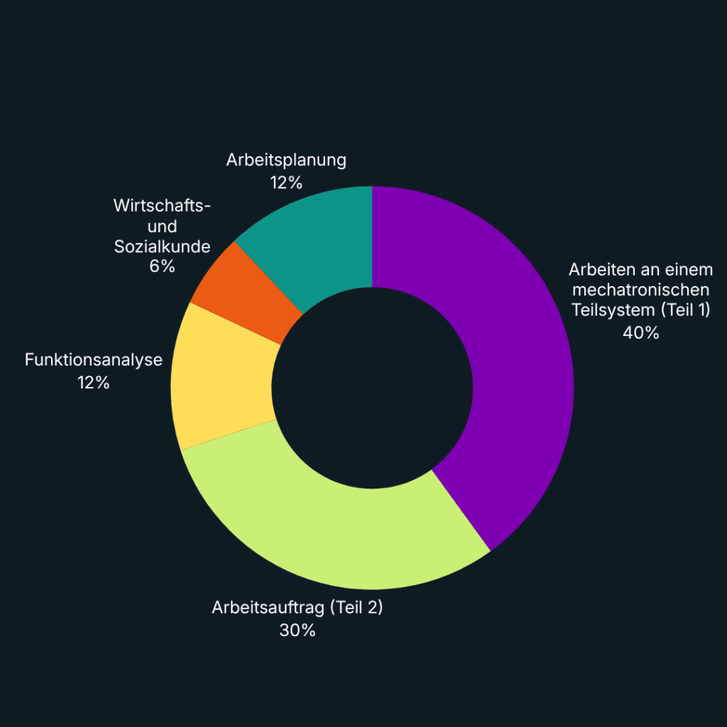 Teil 1 fließt mit 40 % in die Gesamtnote ein, Teil 2 mit 60 %. Innerhalb von Teil 2 zählt der Arbeitsauftrag am stärksten (50 % von Teil 2), gefolgt von Arbeitsplanung und Funktionsanalyse (je 20 % von Teil 2) sowie Wirtschafts- und Sozialkunde (10 % von Teil 2).
