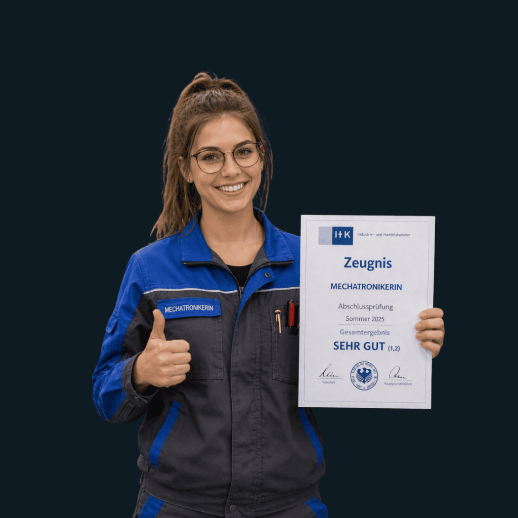 Die Abschlussprüfung für Mechatroniker/-innen ist anspruchsvoll — aber mit der richtigen Vorbereitung absolut schaffbar. Wer den Prüfungsaufbau kennt, die Gewichtung der einzelnen Bereiche versteht und gezielt nach Prüfungsinhalten lernt, hat einen klaren Vorteil. Die wichtigsten Punkte auf einen Blick: Die gestreckte Abschlussprüfung besteht aus Teil 1 (40 %) und Teil 2 (60 %) — mit insgesamt fünf Prüfungsbereichen. Besonders Arbeiten an einem mechatronischen Teilsystem in Teil 1 sowie der Arbeitsauftrag in Teil 2 haben ein hohes Gewicht und sollten deshalb im Mittelpunkt deiner Vorbereitung stehen. Zusammen machen diese beiden praktischen Prüfungsbereiche 70 % deiner Gesamtnote aus. Fang früh an, lerne strukturiert und übe mit echten Prüfungsaufgaben — dann steht einem erfolgreichen Abschluss nichts im Weg.